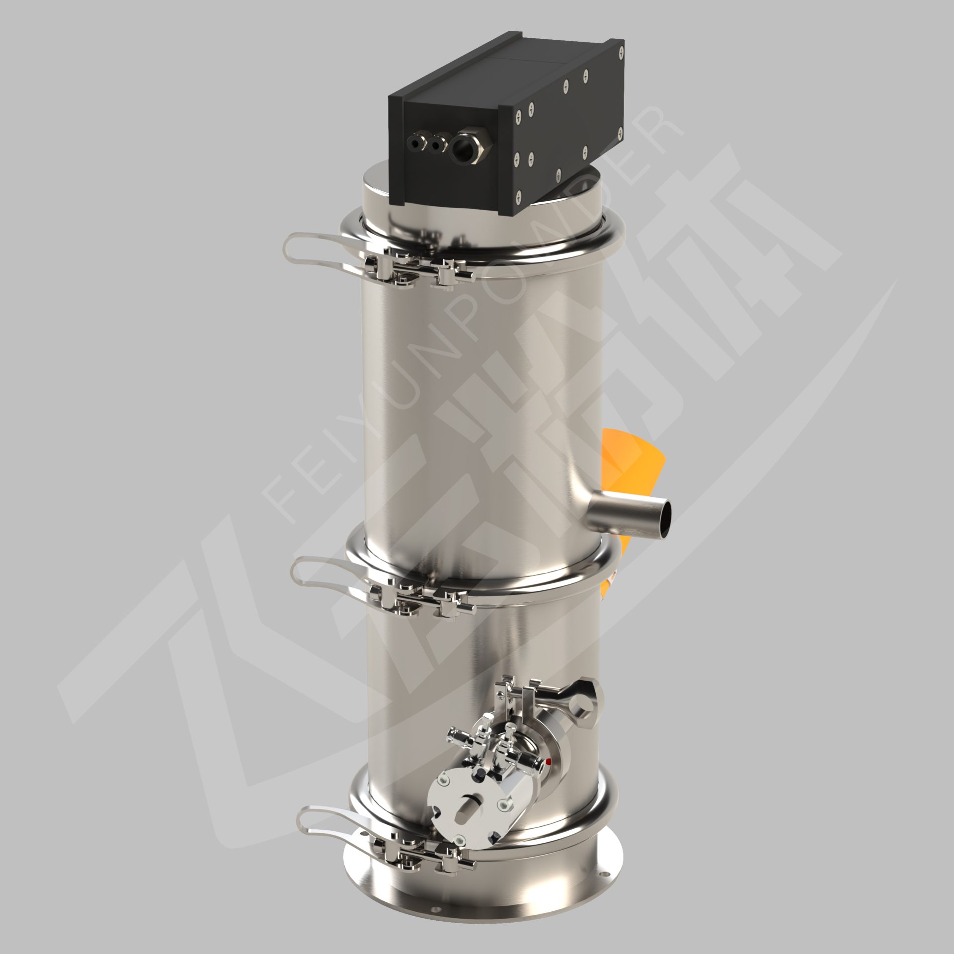 当压缩空气供给真空发生器时,真空发生器就产生负压形成真空气流,物料被吸入吸料咀,形成物气流,经过吸料管到达上料机的料仓内。过滤器把物料与空气彻底分离,当物料装满料仓时,控制器会自动切断气源,真空发生器停止工作,同时料仓门自动开启,物料落到设备的料斗中。与此同时,压缩空气通过脉冲反吹阀自动清洗过滤器。等到时间到或料位传感器发出上料信号时,自动启动上料机。