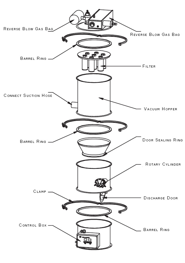 When compressed air is supplied to the vacuum generator, a negative pressure is created, forming a vacuum airflow. The material is sucked into the suction nozzle, forming a material-airflow mixture, which travels through the suction pipe to the feeder’s hopper. The filter separates the material from the air. When the hopper is full, the controller automatically cuts off the air supply, stopping the vacuum generator. Simultaneously, the hopper door opens automatically, allowing the material to fall into the equipment’s feed hopper. At the same time, compressed air automatically cleans the filter via a pulse backflush valve. The feeder restarts automatically when the set time is reached or when the level sensor sends a feeding signal.