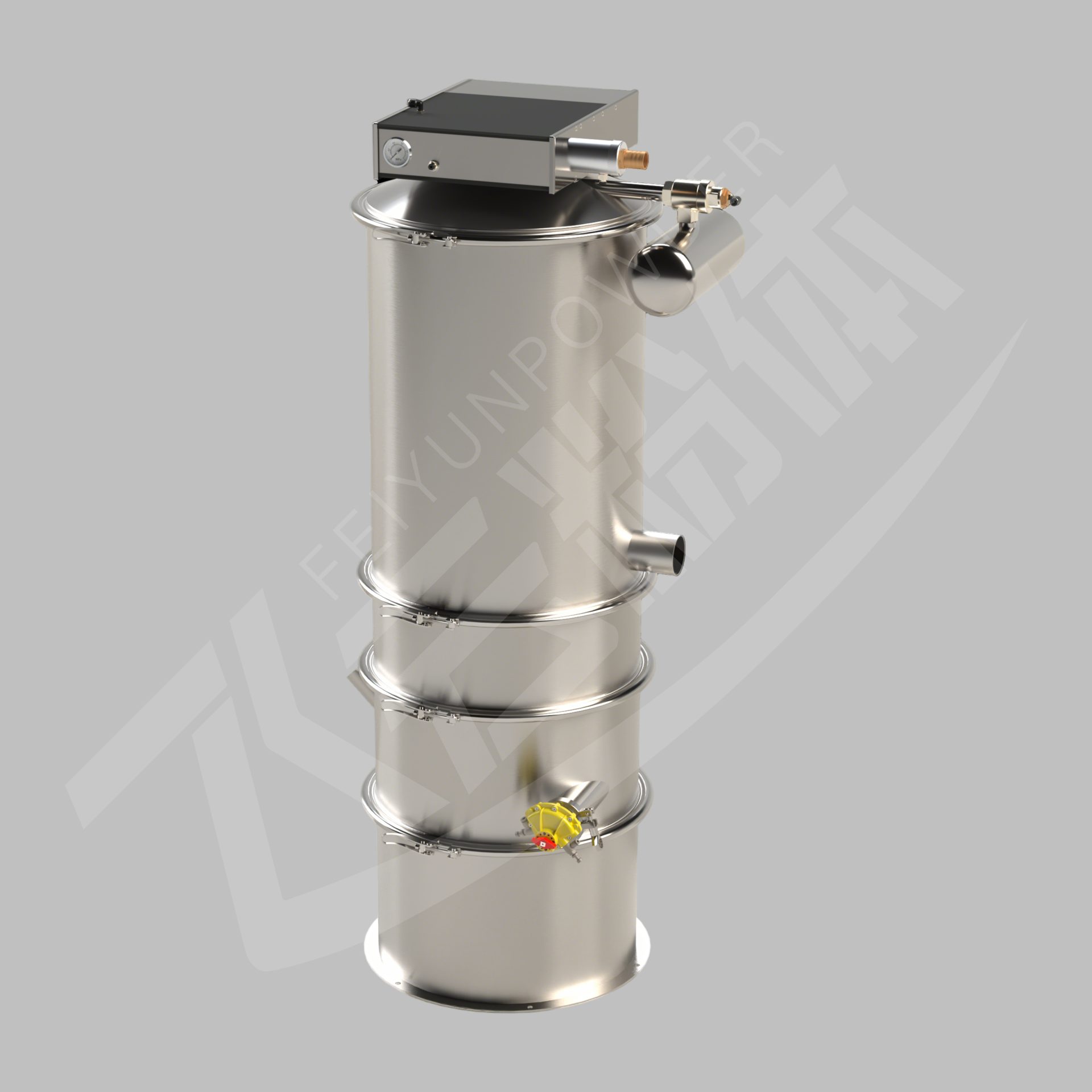 当压缩空气供给真空发生器时,真空发生器就产生负压形成真空气流,物料被吸入吸料咀,形成物气流,经过吸料管到达上料机的料仓内。过滤器把物料与空气彻底分离,当物料装满料仓时,控制器会自动切断气源,真空发生器停止工作,同时料仓门自动开启,物料落到设备的料斗中。与此同时,压缩空气通过脉冲反吹阀自动清洗过滤器。等到时间到或料位传感器发出上料信号时,自动启动上料机。