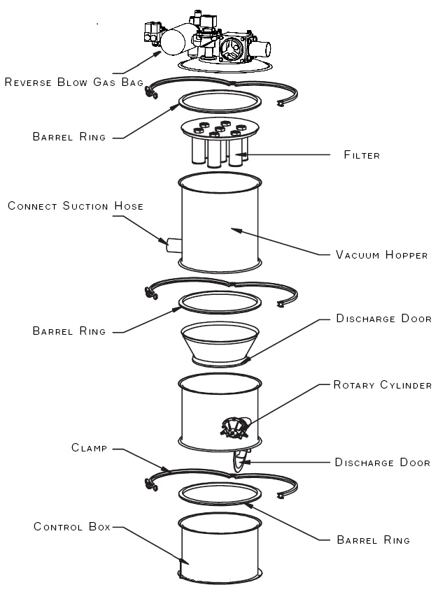 The vacuum feeder consists of a vacuum pump (oil-free and water-free), a vacuum hopper, filters (with multiple options including PE filters, 316L stainless steel filters, or titanium filters), a compressed air reverse blow device, a pneumatic discharge door device, an automatic level control device, a stainless steel suction nozzle, and conveying hoses. The entire system is reasonably designed and exquisitely manufactured.